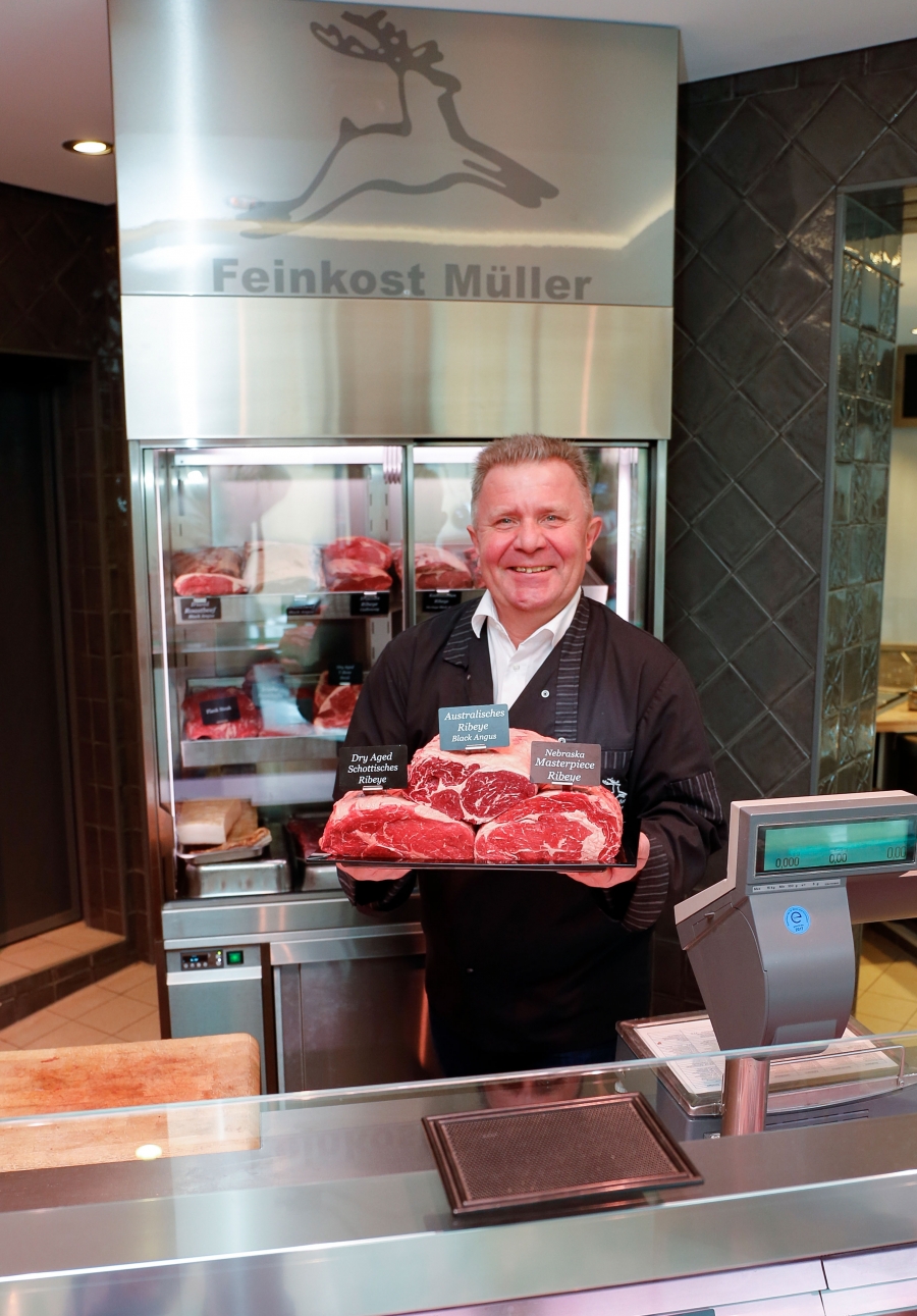 der großformatigen Stücke, aus denen Müller seine Rib-Eye-Steaks schneidet, gehen Feinschmeckern und Grillfans die Augen über: Das Angebot aus fünf Kontinenten reicht vom schottischen Beef über australisches Black Angus bis zum „Masterpiece Rib-Eye“ aus dem US-Bundesstaat Nebraska. Mit Fleisch von Limousin-Rindern eines lokalen Züchters ist auch die regionale Herkunft vertreten.