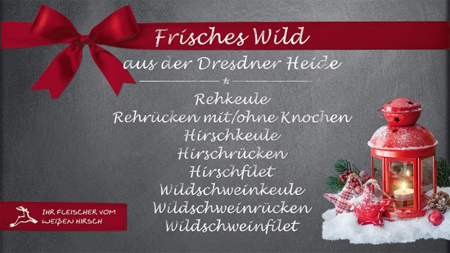 23 Nov '16 Drucken E-Mail Frisches Wild aus der Dresdner Heide Im Herbst und im Winter der ideale Hauptdarsteller auf Ihrer Tafel. Frisches Geflügel Hausgemachte Gänse-, Kalbs-, und Wildfonds