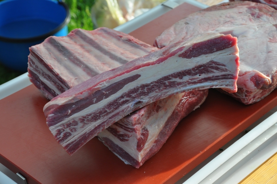 Jetzt kommt ein Versuch ins Spiel. Ribs werden üblicherweise ja am Knochen zubereitet. Allerdings habe ich mich immer schon gefragt, was der Knochen eigentlich dem Fleisch bringen soll, wenn man es „trocken“ zubereitet. Bei Schmorgerichten, selbstverständlich, da gehören die Knochen mit rein. Aber ein Stück Fleisch im Smoker? Kommt hinzu, dass ich vor ungefähr einem halben Jahr ein Stück kurze Rippe bei einem der besten Köche Deutschlands gegessen hatte, der mir erläuterte, der Knochen käme ab, dann wird das ganze scharf angegrillt und anschließend ganz normal low & slow zubereitet. Ich kann Euch versichern, dass jenes Stück bei dem bewussten Koch so war, dass man es eigentlich nicht mehr besser machen kann.